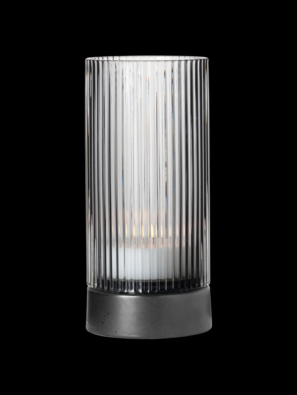 Windlicht aus leichtem Borosilikatglas mit Porzellanfuß. Das gerillte Oberflächendesign sorgt für funkelnde Lichtspiele. Ebenso überzeugen die funktionalen Details. So sorgt der edle Porzellanfuß dafür, dass selbst die Hitze einer ausbrennenden Kerze keinen Schaden auf dem Tisch anrichten kann.