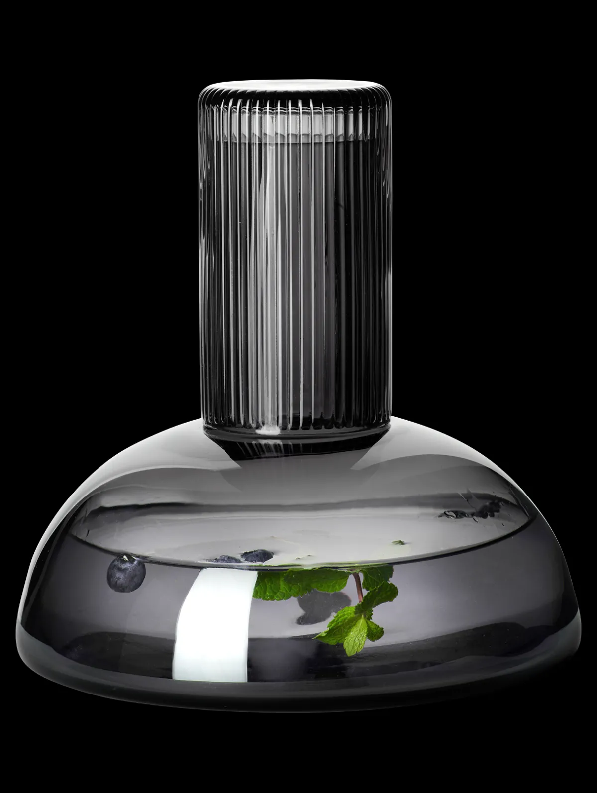 Moderne Glaskaraffe aus durchgefärbtem, mundgeblasenem grauem Glas. Der Clou der Karaffe ist der Verschluss: das umgekehrt aufgesetzte Trinkglas sitzt sicher auf dem schlanken, langen Hals der Karaffe und schützt so den Inhalt und dessen Aromen.