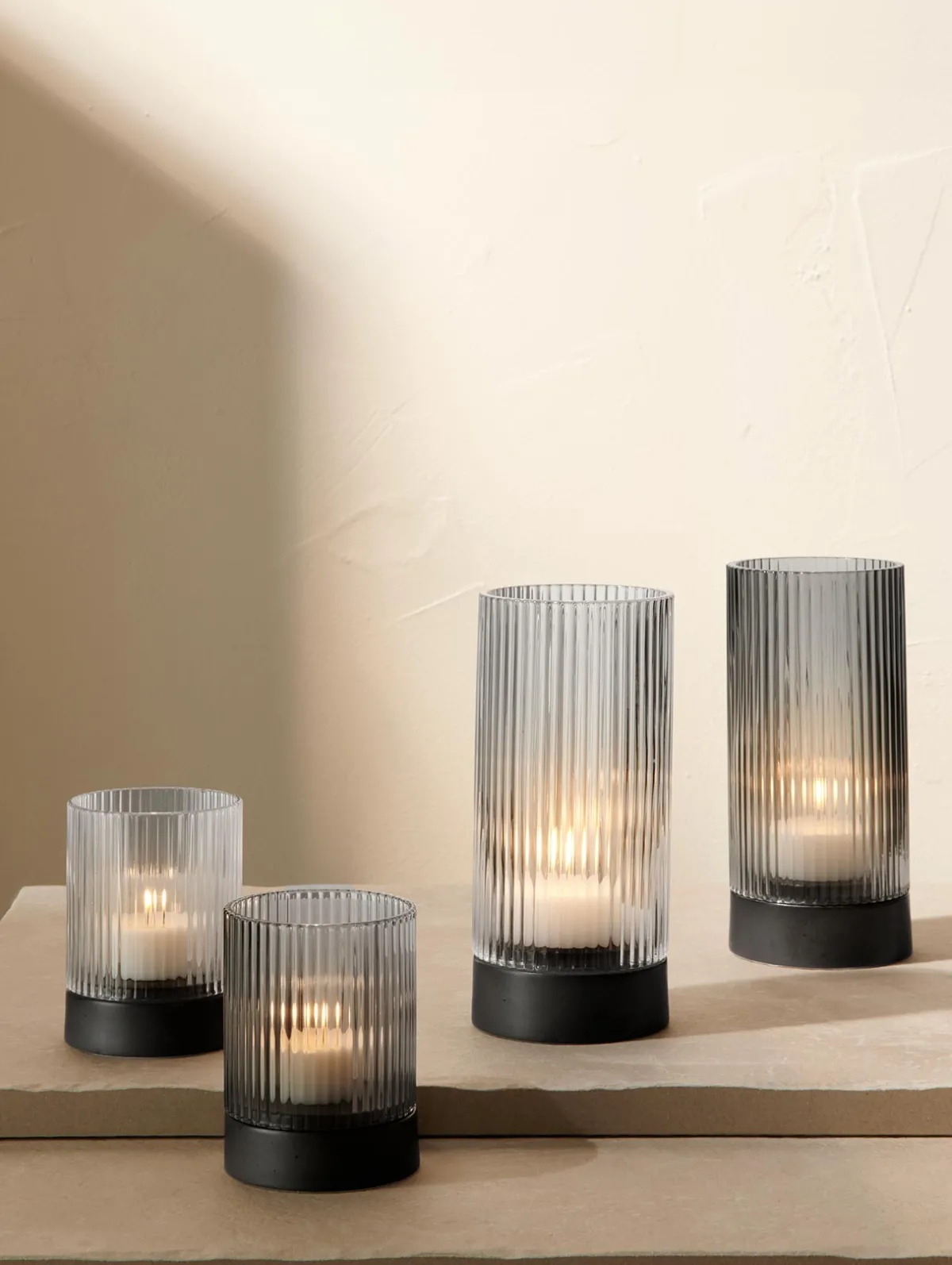 Windlicht aus leichtem Borosilikatglas mit Porzellanfuß. Das gerillte Oberflächendesign sorgt für funkelnde Lichtspiele. Ebenso überzeugen die funktionalen Details. So sorgt der edle Porzellanfuß dafür, dass selbst die Hitze einer ausbrennenden Kerze keinen Schaden auf dem Tisch anrichten kann.