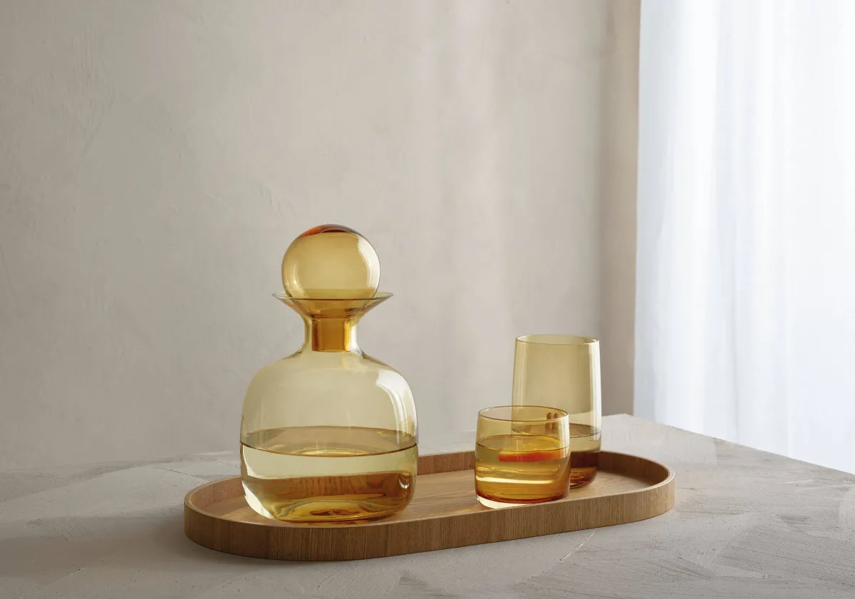 Ob trendige Longdrinks mit Gin oder alkoholfreie Erfrischungen wie Schorlen und Limonaden: das Glas mit 0,4 Liter Fassungsvermögen liegt, wie der kleinere Tumbler, durch einen verstärkten Boden und die leicht bauchige Form wunderbar in der Hand. Wie diese Gläser sind auch die Karaffen, die es in zwei genussgerechten Größen gibt, ein sensorisches und gestalterisches Highlight in der Hausbar. Mit nur einem Hauch von Farbe strahlen die Gläser im Dekor „amber“ wohlige Wärme aus.